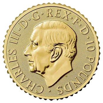 Die Wertseite zeigt ein Porträt von König Charles III. ohne Krone, entworfen von Martin Jennings. Diese Darstellung wurde vor der Krönung des Königs erschaffen. Seine Initialen MJ sind diskret neben dem Porträt eingraviert. Die traditionelle lateinische Inschrift 'D.G.REX.F.D.' – 'Durch Gottes Gnade König, Verteidiger des Glaubens' – ehrt das königliche Erbe. Diese 1/10 Unze Gold Britannia 2025 mit einem Nennwert von 10 GBP ist mehr als nur eine Münze. Sie ist ein Stück lebendige Geschichte, eine bewährte Investition und ein exquisiter Ausdruck britischer Kunstfertigkeit. Profitieren Sie von der steuerfreien Investition in Gold und bereichern Sie Ihre Sammlung mit einem bemerkenswerten Stück. Kaufen Sie jetzt und sichern Sie sich eine goldene Zukunft!