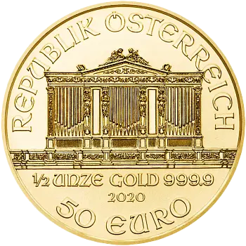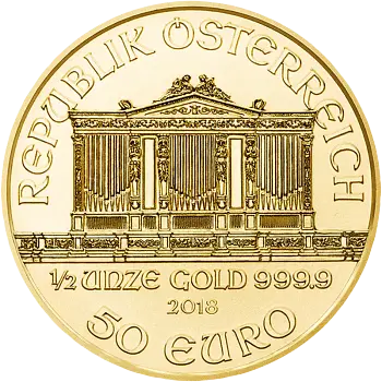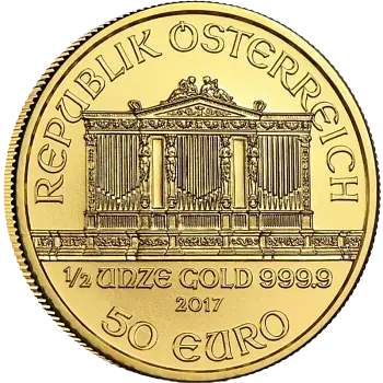 Die Rückseite der Münze zeigt die prächtige Orgel im Großen Saal des Wiener Musikvereins, auch bekannt als 'Goldener Saal'. Dieses meisterhafte Werk wurde von Thomas Pesendorfer, dem Chefgraveur der Münze Österreich, gestaltet und mehrfach ausgezeichnet. Seit 1994 beeindruckt die 1/2 Unze Gold Wiener Philharmoniker mit wechselnden Prägejahren, und die Auflage variiert von 50.000 bis 100.000 Stück jährlich.