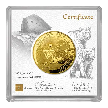 Die Rückseite dieser exklusiven Münzedition präsentiert stolz dasWappen der Republik Armenien. Darunter sind alle wichtigen Informationen für den Anleger eingeprägt: derNominalwert in armenischen Dram, dasFeingewicht, dieReinheit des Goldes(oft 999.9), dasPrägejahr 2025und das Symbol der Prägestätte. Diese Angaben unterstreichen die offizielle Prägung und den hohen Standard der Münze.