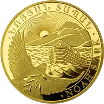 Die Vorderseite derArche Noah Goldmünzeerzählt die biblische Geschichte mit beeindruckender Detailtreue. Zentral abgebildet ist das majestätische Schiff „Arche Noah“, dessen Name in armenischer und englischer Umschrift die Prägung umgibt. Im Vordergrund fliegt dieTaube mit dem Ölzweig im Schnabel– ein universelles Symbol für Frieden und Hoffnung. Im Hintergrund erhebt sich dieimposante Bergsilhouette des Ararat Gebirges, über der die aufgehende Sonne strahlt. Dieses Motiv verbindet auf einzigartige Weise Geschichte, Glaube und die natürliche Schönheit Armeniens.
